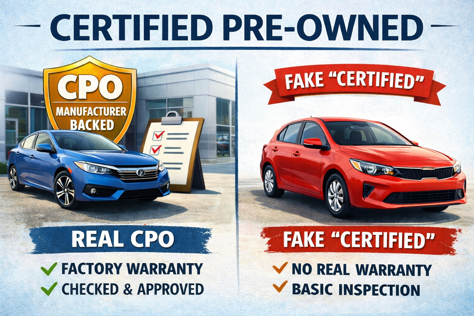 A true Certified Pre-Owned (CPO) can only be sold by new car dealerships of the same brand. For example, you can buy a CPO Toyota Camry from a Toyota dealership, but you cannot buy a CPO Toyota Camry from a Honda dealership. The CPO is backed by the manufacturer, and the vehicle comes with a factory warranty. These vehicles consist of only about 20% of used vehicles at a new car dealership, so the CPO is considered a premium vehicle. As you would expect, the CPO vehicle also commands a premium sale price. It must be noted that while most used car dealerships advertise their vehicles as, "certified", these vehicles are never considered CPO vehicles for lemon law purposes.